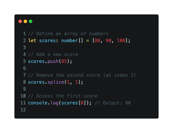 TypeScript helps catch bugs early. For example, if you try to push a string into a number array, it will show an error:
