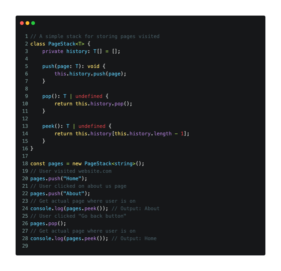 Use generics (<T>) so your stack can hold any type: numbers, strings, or even objects.